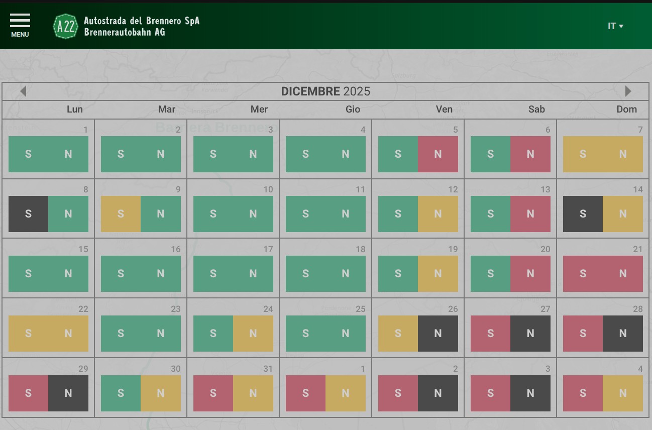 Previsioni traffico Autostrada del Brennero. A22 prevede sei giornate da bollino nero nel mese di dicembre 2025. In dettaglio sono: lunedì 8 e domenica 14 dicembre in direzione sud, il 26,27,28 e 29 dicembre in direzione nord. Due giornate da bollino nero sono previste anche per i primi giorni di gennaio 2026: venerdì 2 e sabato 3 gennaio in direzione nord.