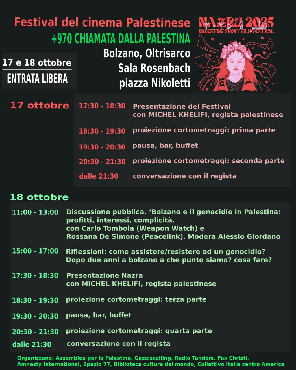 Cultura. Venerdì 17 e sabato 18 ottobre, presso la sala Rosenbach di piazza Nikoletti a Bolzano, l’Assemblea pubblica per la Palestina ospiterà il NAZRA 2025 Palestine Short Film Festival, una rassegna di cortometraggi dalla e sulla Palestina, girati nell’ultimo anno da registi palestinesi. Nazra significa “sguardi” e questi film rappresentano gli sguardi dei palestinesi sulla loro terra, dove l’arte è una forma importante di resistenza culturale e politica. Il festival è nato nel 2017 e nel mese di ottobre sarà ospitato in decine di città italiane, tra cui Bolzano. A presentare la rassegna sarà il regista Michel Khleifi, considerato un maestro del cinema palestinese.