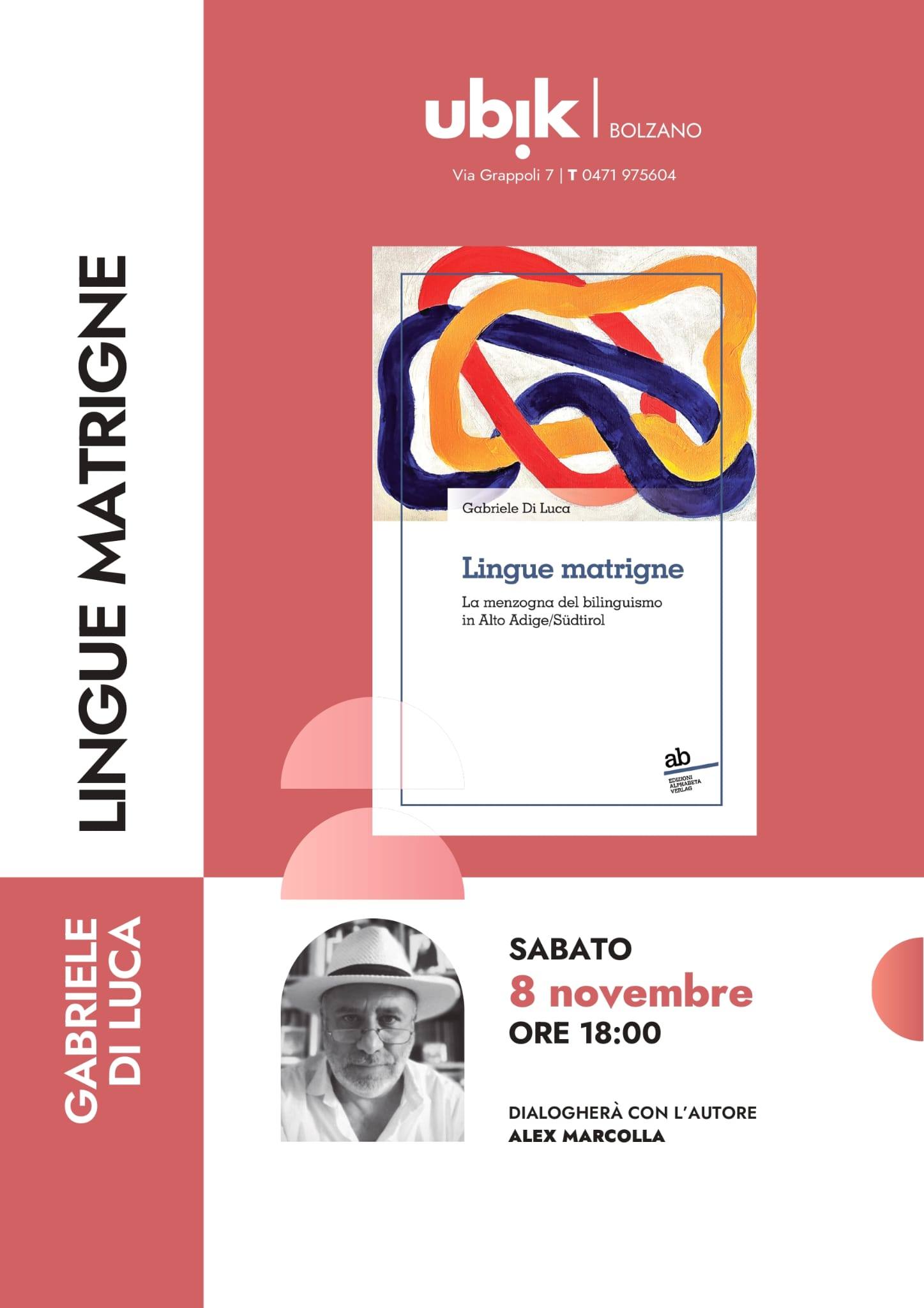 Cultura. Il nuovo libro di Gabriele Di Luca “Lingue matrigne: la menzogna del bilinguismo in Alto Adige/Südtirol” (Edizioni Alphabeta Verlag) verrà presentato alla libreria Ubik di Bolzano sabato 8 novembre 2025 (ore 18). L’autore sarà introdotto e intervistato da Alex Marcolla.