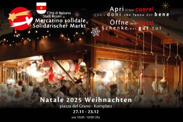 Bolzano. La ventunesima edizione del Mercatino di Natale solidale, iniziativa che promuove azioni di solidarietà durante il periodo natalizio attraverso il coinvolgimento delle realtà associative cittadine, verrà inaugurato mercoledì 3 dicembre 2025 in Piazza del Grano a Bolzano. Al mercato partecipano numerose associazioni attive nel settore sociale e nel volontariato. I prodotti esposti, realizzati da soci e volontari, richiamano la tradizione locale oppure rappresentano esempi di artigianato proveniente da diversi Paesi. Il ricavato delle vendite è destinato al finanziamento di progetti umanitari e di cooperazione allo sviluppo in varie aree del mondo, oltre a sostenere l’impegno quotidiano delle associazioni sul territorio cittadino.