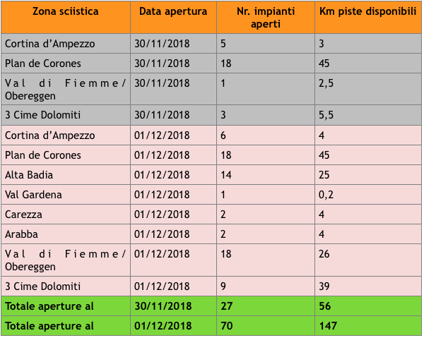 Nello specifico – grazie ai sistemi di innevamento programmato che hanno sfruttato le giornate e le notti di freddo a novembre e permesso quindi l’apertura puntuale degli impianti – si potrà sciare nelle zone di Cortina d’Ampezzo, Plan de Corones, Alta Badia, Val Gardena, Carezza, Arabba, Val di Fiemme/Obereggen e 3 Cime Dolomiti. La seconda ondata di aperture ufficiali si avrà invece tra il 6-7 dicembre.