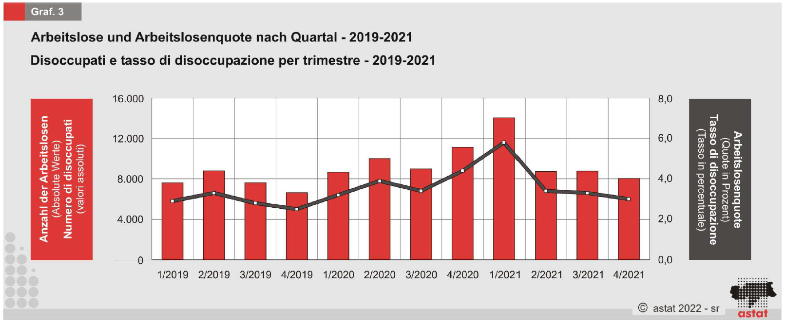 Il totale degli occupati nel trimestre rimane quindi invariato ma il dato è più profondo: aumenta l’occupazione maschile e diminuisce quella femminile. Si parla infatti di +1.500 occupati uomini e –1.500 donne. Il tasso di occupazione (15-64 anni) nel quarto trimestre 2021 si attesta al 73,0%, in aumento di 3 punti percentuali rispetto al quarto trimestre 2020. Il tasso di occupazione annuo scende al 70,7% (2020: 72,1%). Il numero medio di disoccupati nel 2021 è pari a 9.900 persone. Il tasso di disoccupazione scende nel quarto trimestre 2021 al 3,0%. Il tasso per gli uomini ammonta al 2,2%, mentre per le donne al 4,0%. Il tasso di disoccupazione annuo pari al 3,8%.