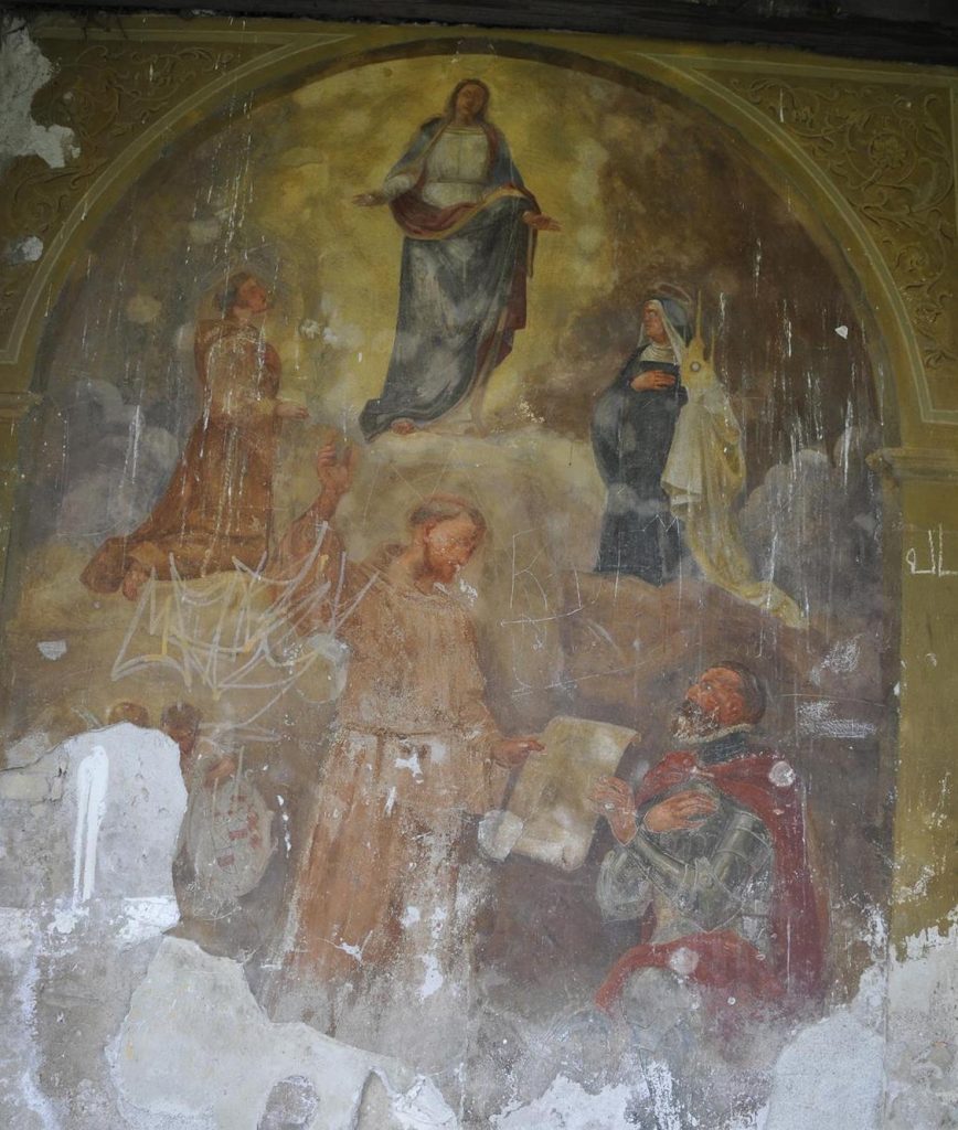 L’affresco mostra un uomo con armatura e mantello rosso inginocchiato che consegna una pergamena a San Francesco, in piedi di fronte a lui. Si tratta della rappresentazione del barone Engelhard Dietrich von Wolkenstein – Trostburg, fondatore del Convento dei Cappuccini di Bolzano. San Francesco benedice l’uomo con la sua mano destra, e allo stesso tempo indica il cielo, dove in piedi su una nuvola, avvolta da un’aureola luminosa, Maria Immacolata viene venerata da Sant’Antonio in ginocchio con il giglio e Santa Chiara con l’ostensorio. Sui lati interni di entrambe le pareti laterali dell’affresco si sono conservati i resti di un’iscrizione, che avvalorano questa interpretazione. Nella rappresentazione dello stemma e nell’iscrizione si fa cenno anche a Katharina von Hepperger, la seconda fondatrice del Convento, che nel 1816 mise a disposizione dei Cappuccini l’edificio e il giardino per ripristinare il Convento che sei anni prima era stato sospeso.