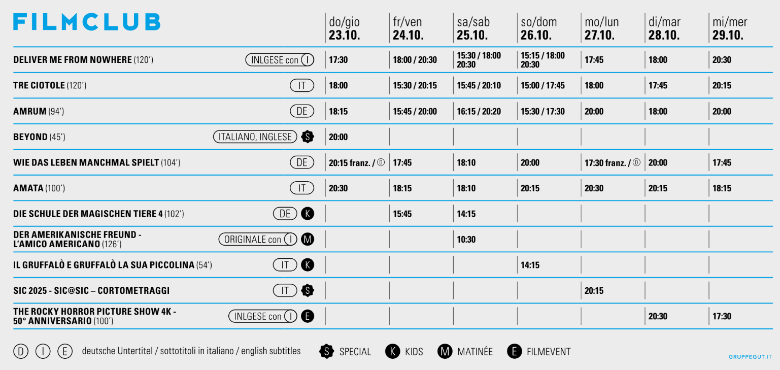 Di seguito il programma completo del cinema di via Dr. Streiter dal 23 al 29 ottobre 2025:
