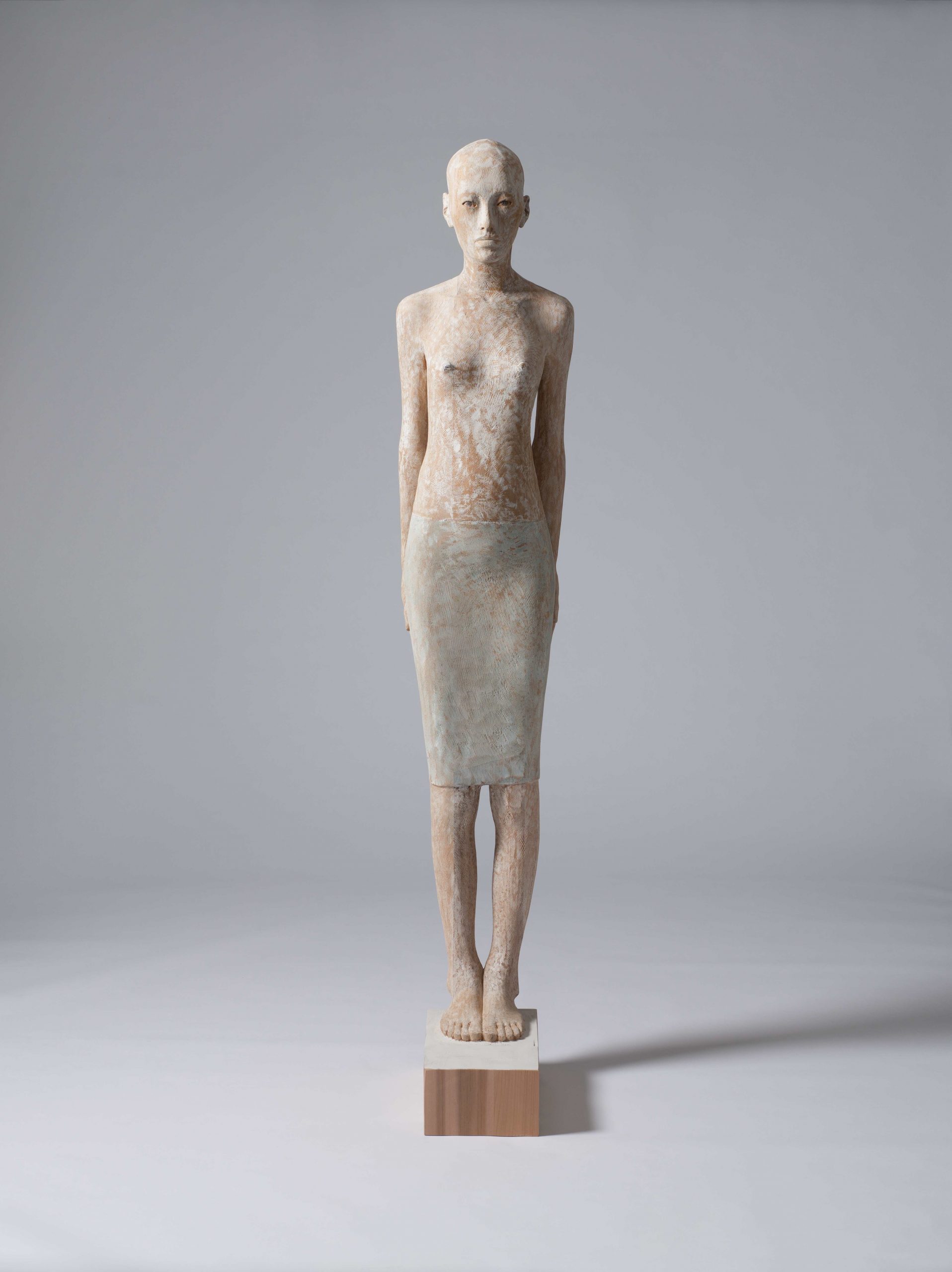 Alcune riportano un dettaglio particolare che ci appare esotico, una capigliatura, la forma di un copricapo in cui risuonano esperienze di viaggi dell’artista in Sri Lanka, nell’isola Sulawesi, o in Nuova Zelanda. Ma non c’è mai compiacimento o virtuosismo nelle opere di Moroder, piuttosto quello che a noi sembra un costante elemento di attenzione a non superare una certa soglia di rivelazione. In questo ondeggiare tra riconoscibilità ed estraneità è racchiuso un punto centrale, secondo Markus Klammer: le sculture non somigliano né rappresentano qualcosa, non implicano storie e narrazioni. E in questo si differenziano radicalmente dalla statuaria sacra, dalle figure della Madonna e dei santi della tradizione, ma anche dai kouroi e dalle korai della statuaria greca, con cui pure noi riconosciamo affinità formali, ma che “rappresentavano divinità o avevano funzioni rituali, contenevano quindi un racconto” precisa lo studioso. Le figure di Moroder si staccano anche da altre ricerche più contemporanee di artisti conterranei, improntate a un più ovvio naturalismo.